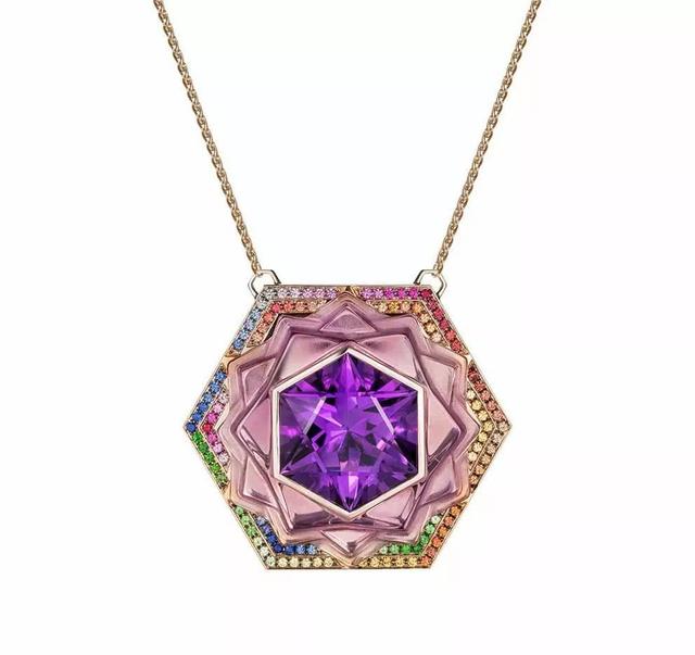 本届获奖作品中,宝石色彩最绚丽的是黎巴嫩设计师 Noor Fares 的「Sahasrara」挂坠项链,设计灵感源自几何造型的密宗符号——「自觉轮」 (Sahasrara)。挂坠中央可以看到一颗六角形切割的紫水晶 ,外圈围镶彩色蓝宝石、红宝石、碧玺 等彩宝,形成彩虹一般缤纷的色彩。