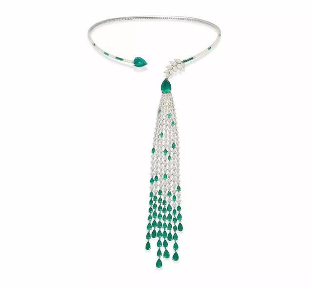 同样引人注意的还有Gismondi 1754 的 Essenza 白金项链,项圈两端分别延伸为一颗水滴形祖母绿和一串宝石流苏 ,由水滴形钻石和祖母绿交替衔接,形成帘幕般垂坠摇曳的视觉效果。