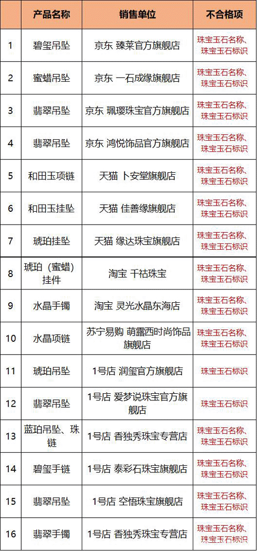 不合格原因主要集中在珠宝玉石名称和标识,共涉及16家网店,具体名单看下面。