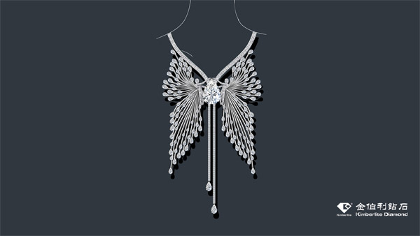 历时近半年打造,该套作品主钻可拆卸,贴合穿戴设计,彰显人体美学,蝴蝶羽翼微微颤动,灵动生趣,韵味悠长。作品总重584.54克,梨形主钻51.71克拉,颜色D色,净度FL,均达到钻石鉴定的最高级别。设计师以写实手法,打造翩然起舞的化蝶奢华项链,两蝶簇拥下的主钻愈发纯净璀璨,仿若上帝沉静的双眸,无论时间更迭,光年迢迢,依旧折射出千万种可能。