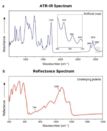 使用红外光谱仪以衰减全反射率法(ATR)和漫反射法进行测试,测试谱图如图4所示。如图4a可知外层蜡皮壳在1500-2000cm-1范围内具有吸收带,与蜡的特征相收相似,同时在2852、2919、2962、3035cm-1处出现与环氧树脂有关的特征吸收。在皮壳脱落部位进行漫反射测试,如图4b所示在744和1050cm-1处有吸收峰,以及400-600cm-1之间的四个谱带,这与硬玉的特征吸收一致。这种人造皮壳可通过其低硬度,异常的紫外荧光和红外光谱检测等手段来进行检测区分。