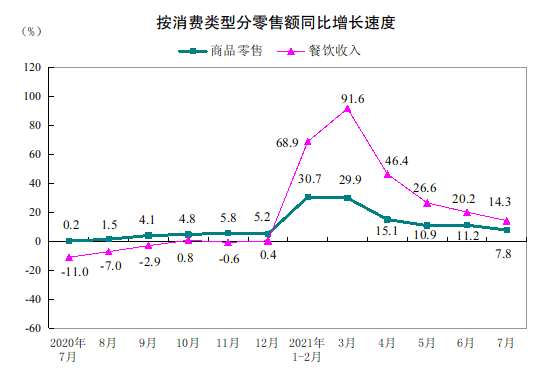 按消费类型分,7月份,商品零售31174亿元,同比增长7.8%;餐饮收入3751亿元,增长14.3%。1—7月份,商品零售221366亿元,同比增长18.7%;餐饮收入25463亿元,增长42.3%。