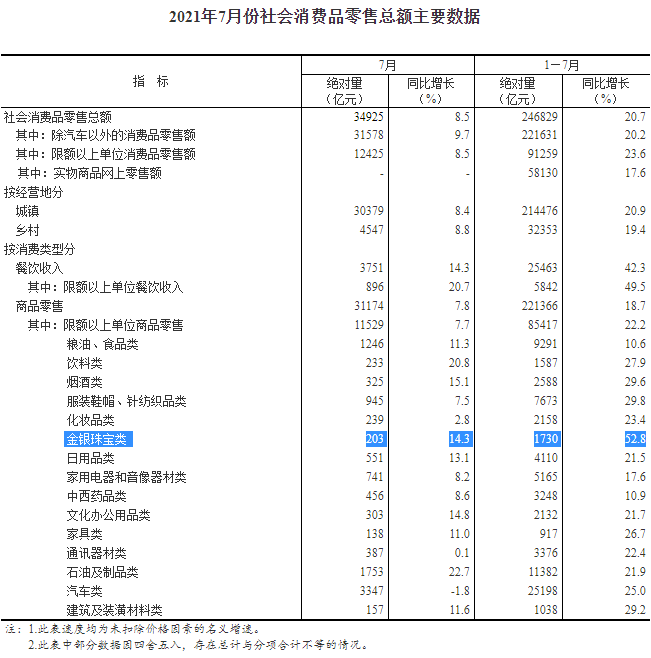 来源:国家统计局 原标题:2021年7月份社会消费品零售总额增长8.5%