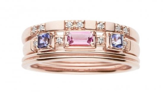 共由3枚戒环组成,镶嵌1颗长阶梯形切割粉色碧玺,2颗方形切割堇青石,点缀圆形切割钻石。
