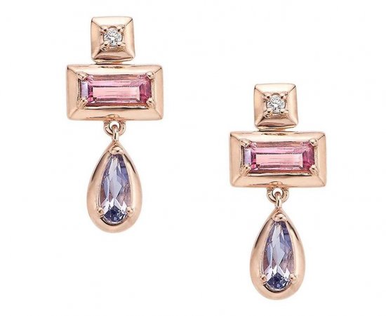 镶嵌2颗长阶梯形切割粉色碧玺,2颗水滴形切割堇青石,点缀圆形切割钻石。