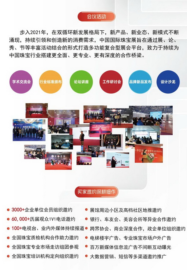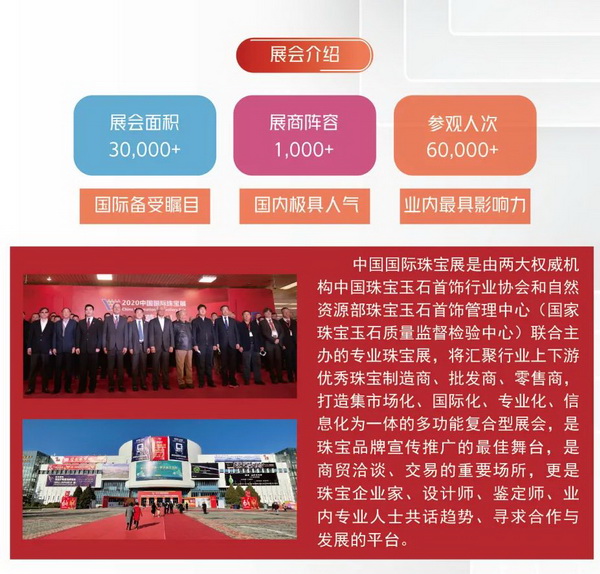 2021中国国际珠宝展,将于11月18日-22日在北京中国国际展览中心(老馆)隆重举行。本届展会由两大权威珠宝机构中国珠宝玉石首饰行业协会和自然资源部珠宝玉石首饰管理中心(国家珠宝玉石质量监督检验中心)联合主办,30,000+㎡展出面积,1000+参展企业,预计将超60,000人次参观量,是每年国际备受瞩目,国内极具人气,业界最具影响力的专业珠宝展。