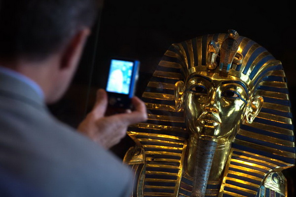 2015年12月18日,一名参观者在埃及博物馆内拍摄图坦卡蒙黄金面具。新华社记者 孟涛 摄
