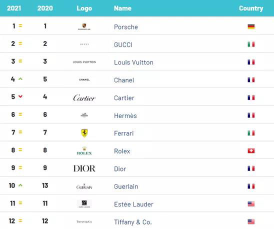 英国品牌评估机构公布2021全球高档和奢侈品牌价值50强