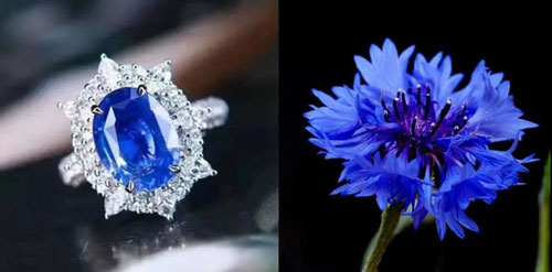 我们首先说说蓝色系的蓝宝石,我们常常听到有经典的“皇家蓝”和比较珍贵的“矢车菊蓝”。其中克什米尔产的矢车菊蓝宝石最为贵重,市面上较少,其内部特殊的包裹体使其呈现出天鹅绒般的质感。