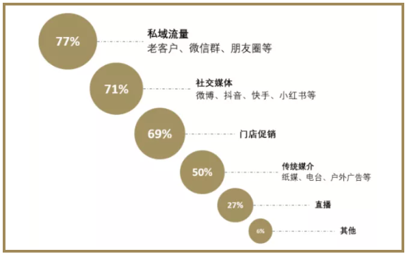 金饰零售商正在改变其营销和获客策略。2021年的调研结果显示,在未来一两年内,他们将重点投入私域流量和社交媒体营销。门店促销不再是主要的营销和获客渠道,直播销售的重要性也被降级。