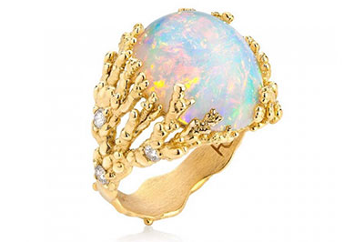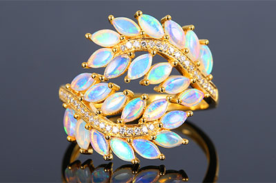 欧泊的矿物学名称为“蛋白石”,其名称来源于罗马语,意为“集宝石之美于一身”。其组成矿物为蛋白石(Opal),另有少量石英、黄铁矿等次要矿物。在白色或浅灰色体色上出现变彩的欧泊,就是白欧泊啦,是众多欧泊品种中最常见的一种,主体呈透明至半透明。对白欧泊而言,变彩颜色可以是红色、紫色、橙色、黄色、绿色和蓝色等。其中,红色的变彩更稀有、更有价值。