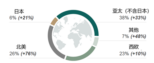 图. 开云集团2021年各区域市场份额占比及该区域销售额增幅