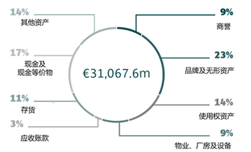 资产方面,总资产同比增长10.9%至310.68亿欧元,资产结构如下图所示,可以看出与国内珠宝上市企业相比,奢侈品集团的存货占比较低,而品牌及无形资产的占比较高。
