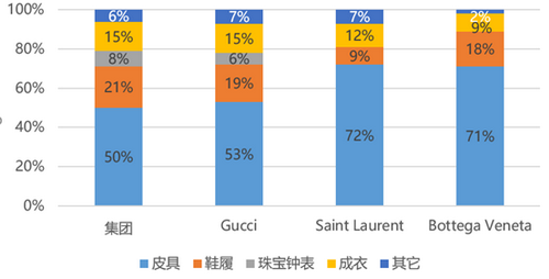开云集团旗下品牌之间的规模差异十分显著,前三大品牌Gucci(古驰)、Yves Saint Laurent(圣罗兰)、Bottega Veneta(葆蝶家)贡献了集团品牌业务78%的收入及94%的经营利润。