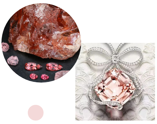摩根石的名字是用美国著名银行家约翰·皮尔庞特·摩根的名字命名的,它与祖母绿、海蓝宝石同属绿柱石家族,颜色主要以粉红色、浅橙红色到浅紫红色、玫瑰色、桃红色为主。因其颜色无比柔美,摩根石更像是绿柱石家族中的一位小妹妹。粉色的摩根石,代表着温馨、甜蜜,让人只想将它拥入怀中。摩根石净度高、硬度高、质量相对较大,50克拉以上粒度的摩根石并不稀缺,甚至粒度达到100克拉以上且高净度、高质量的摩根石的数量相较其他宝石来说也比较多,因此,普通摩根石的价格其实并不昂贵。如想要收藏,一定要选择颜色饱和度高、净度高、粒度大的摩根石。