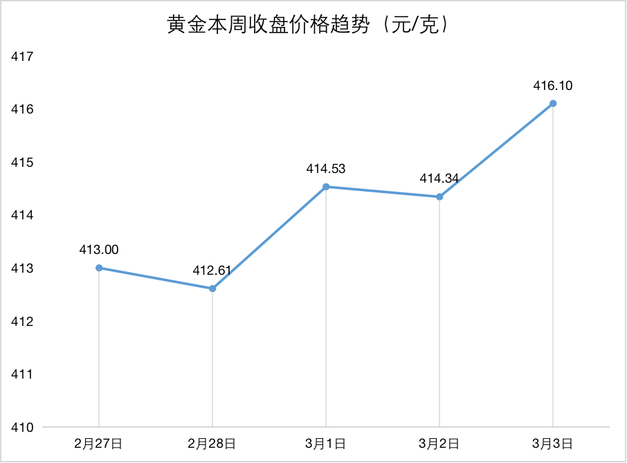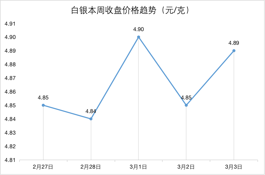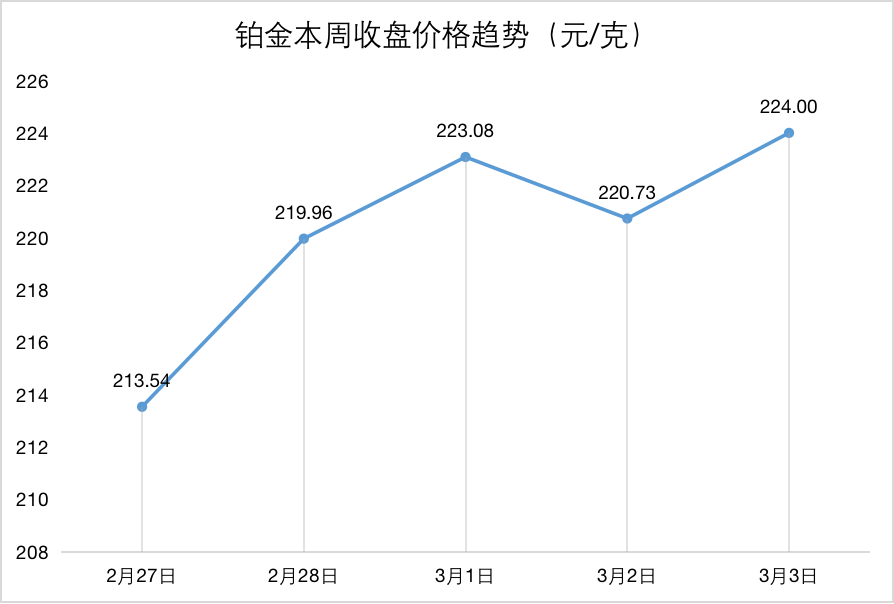 特别说明: 1、数据来源于上海黄金交易所; 2、3月3日数据为当天17:00的收盘价; 3、黄金、白银、铂金价格分别对应Au99.99、Ag(T+D)、Pt99.95的交易数据。 【相关声明】 *本文相关新闻出处包括但不限于相关机构官网、公告及公众媒体平台,有关讯息不代表我司观点及立场。 *文章图片部分来源于网络,如有侵权请告知删除。