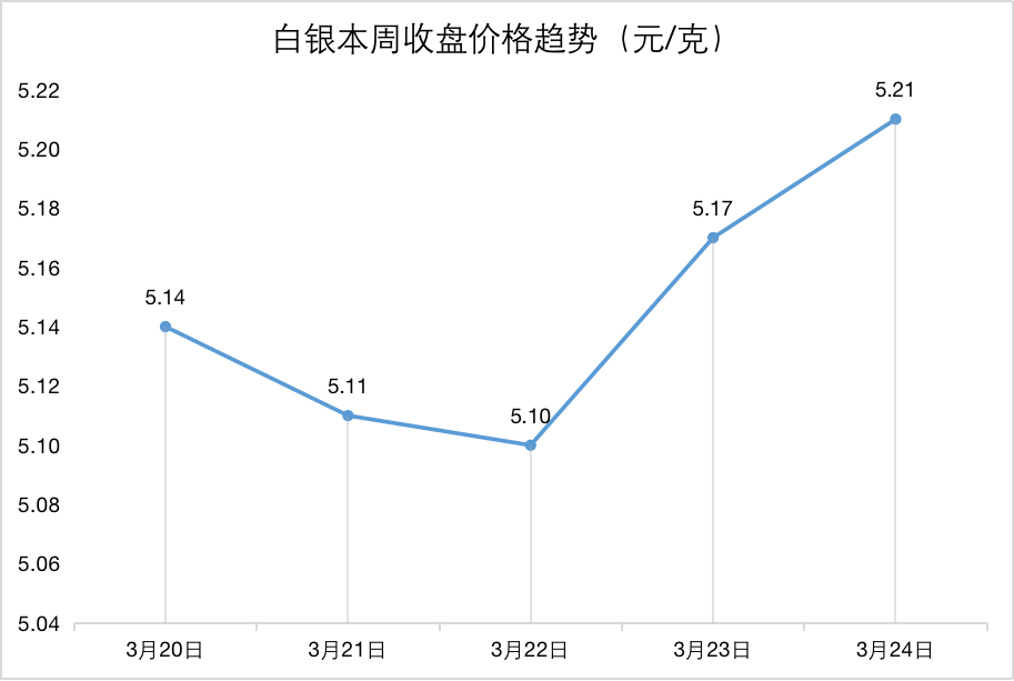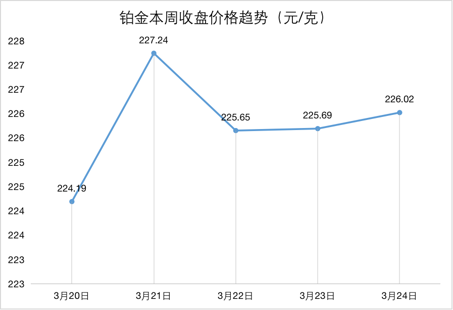 曼卡龙定增获证监会批准 近日曼卡龙向特定对象发行股票的注册申请获中国证监会审批通过。募集说明书显示,曼卡龙拟向不超过35名合格投资者定向发行不超过6,120万股股份,募集资金不超过7.16亿元,用于“曼卡龙@Z概念店”终端建设项目、全渠道珠宝一体化综合平台建设项目以及“慕璨”品牌与创意推广项目。 原材料价格一周走势 特别说明: 1、数据来源于上海黄金交易所; 2、3月24日数据为当天15:30的收盘价; 3、黄金、白银、铂金价格分别对应Au99.99、Ag(T+D)、Pt99.95的交易数据。 *文章图片部分来源于网络,如有侵权请告知删除。