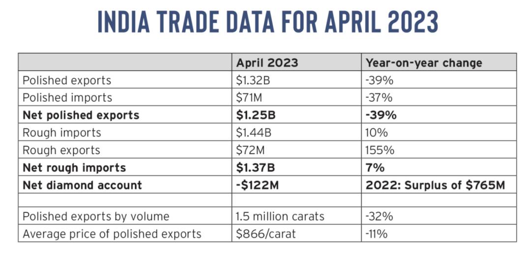 受美国和中国消费市场放缓影响,2023年前4个月中有3个月成品钻出口额下降。