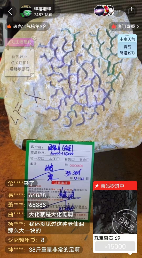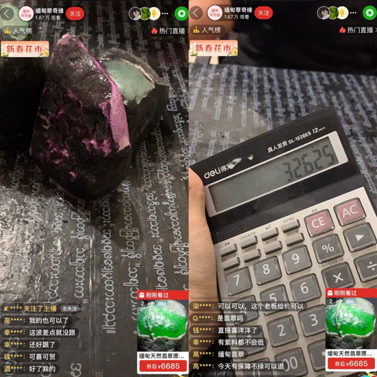 还有一些直播间内,“合车”的戏码正在上演,现场切石、现场回收,只需499元先“占位”“切涨”后再付9999元尾款,就能和其他“合车”的消费者“拼单”购买、共享“收益”。现场切割的十几块翡翠原石中有三块被主播描述为“成色极好”“出绿”或“出紫”,随即有老板进来“收货”,开出580万元的回收价,主播通过计算器向粉丝展示,抽去10%的手续费后,参与拼单的16位买家每人都能获利32.6万元,并表示钱款将在30分钟之内打到“跟车”粉丝的账户上。