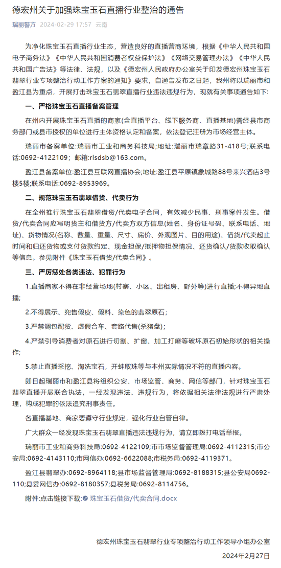 德宏州关于加强珠宝玉石直播行业整治的通告