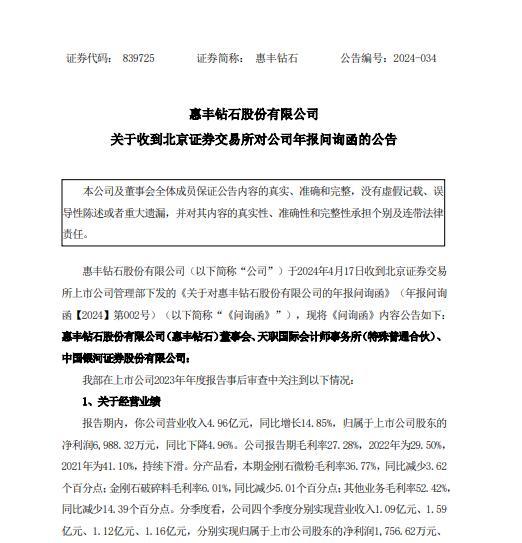 4月17日,惠丰钻石收到北交所上市公司管理部下发的《关于对惠丰钻石股份有限公司的年报问询函》。这份问询函针对惠丰钻石2023年年报中的多个问题提出质疑,涉及公司经营业绩、销售费用和研发费用、应收款项、存货和募投项目等方面,要求公司就相关事项进行详细说明和解释。这一问询函的下发,引发市场对惠丰钻石经营状况的关注和担忧。