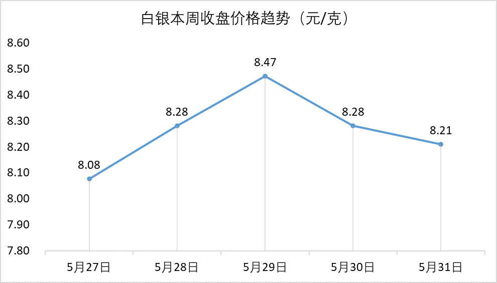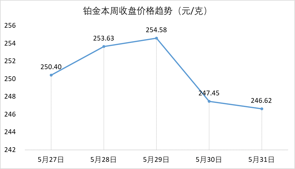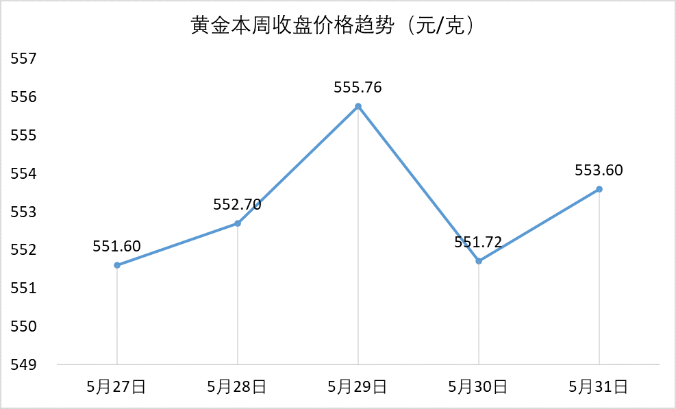 东华美钻拟回购股份 近日,东华美钻宣布拟以公司自有资金回购部分股份,以促进公司长期健康发展、增强未来投资者信心、维护投资者利益。本次拟回购的股份数量不超过25,000,000股,占公司目前总股本的比例不高于12.53%,回购价格为2.68元/股。 豫园股份拟出售珠宝业务子公司部分股份 近日,豫园股份发布公告,表示正在筹划以增资扩股方式为子公司上海豫园珠宝时尚集团有限公司引入外部投资者暨融资事项,计划融资金额不超过人民币20亿元,外部投资者数量合计不超过40家。本次交易完成后,外部投资者持有该公司股权比例合计不超过20%。 原材料价格一周走势 特别说明: 1.数据来源于上海黄金交易所; 2.5月31日数据为当天15:30的最新价; 3.黄金、白银、铂金价格分别对应Au99.99、Ag(T+D)、Pt99.95的交易数据。