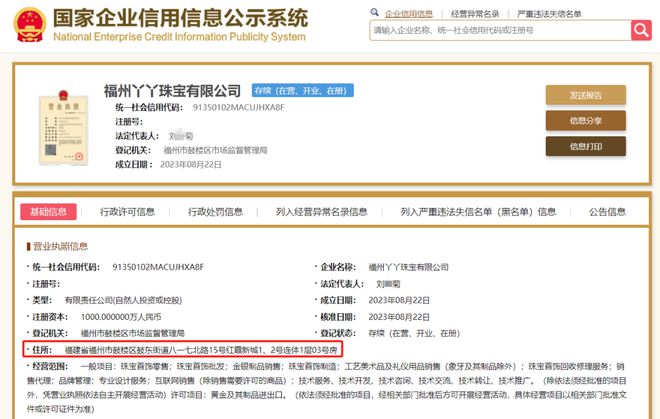 记者通过国家企业信用信息公示系统查阅到福州丫丫珠宝有限公司目前仍显示存续状态,注册地址就在中银金行(八一七路店)所在店铺。随后,记者到福州市鼓楼区鼓东市场监管所查询该店信息,鼓东市场监管所相关负责人告诉记者,目前该所已接到相关信息,经辖区工作人员上门联系、电话联系,均无法与该公司负责人取得联系,注册地即金店也已关门。按规定,该所已将福州丫丫珠宝有限公司列入经营异常,目前正向上级报告。