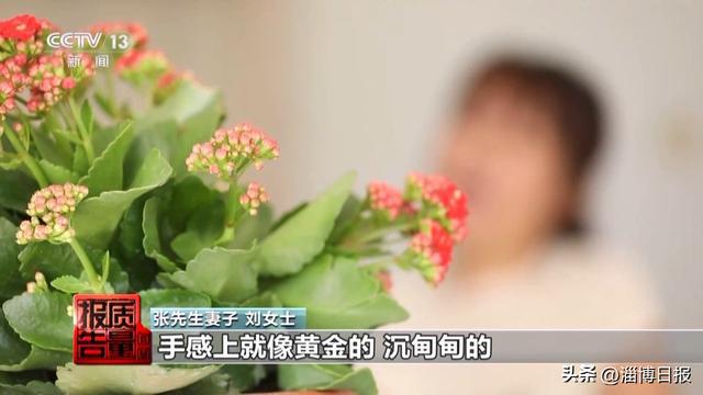 张先生妻子 刘女士:我一看特高兴,从外观上、色泽上、手感上就像黄金,沉甸甸的。我问多少钱,他告诉我499块9,我说可能吗,我说黄金500多块钱一克,他说你放心,说这就3到5单,抢的,而且假一赔十,确保999足金,这我才相信。