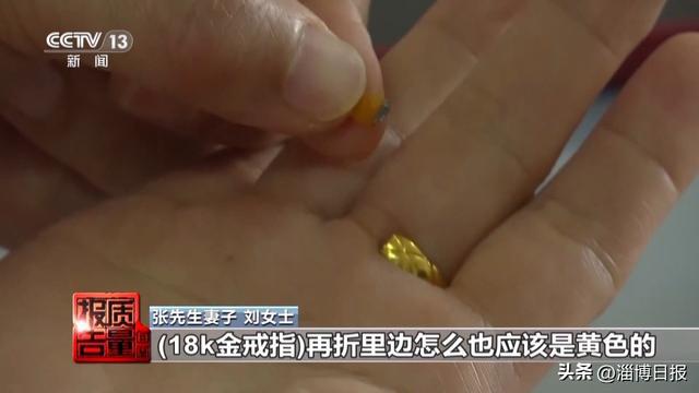 张先生妻子 刘女士:我们家孩子五年级比较淘气,因为写作业跟我着急,无意中一拍桌子戒指折了,戒指折了我一看发黑,我就觉得不对劲了,18k金戒指再折里边也应该是黄色的,怎么能是黑色的呢,我就怀疑这个手串是不是也是假的。