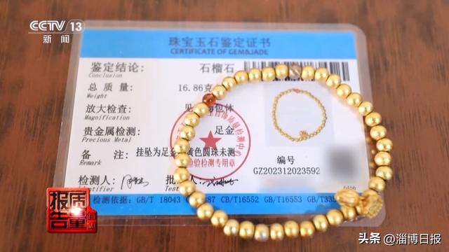 夫妻俩带着黄金手链到本地的一家鉴定中心做鉴定,结果发现这串黄金手链只有配饰的小滴溜是黄金足金,约0.3克,其它卡5的珠子均检测为铜合金。