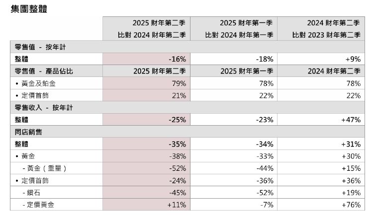 10月17日晚间,香港珠宝品牌六福集团(00590)公布最新零售销售表现。数据显示,2025财年第二季度(即2024年第三季度),该集团整体零售值同比下滑16%,整体零售收入同比减少25%,同店销售同比减少35%。