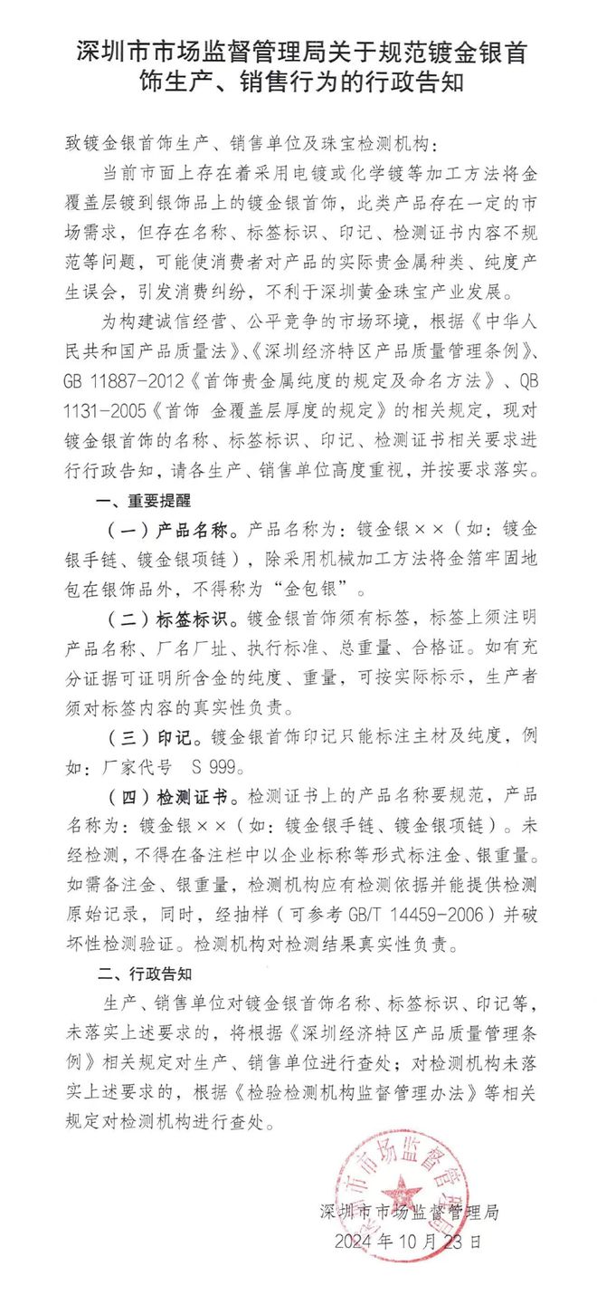 针对这一现象,深圳市市场监督管理局出具关于规范镀金银首饰生产、销售行为的行政告知。