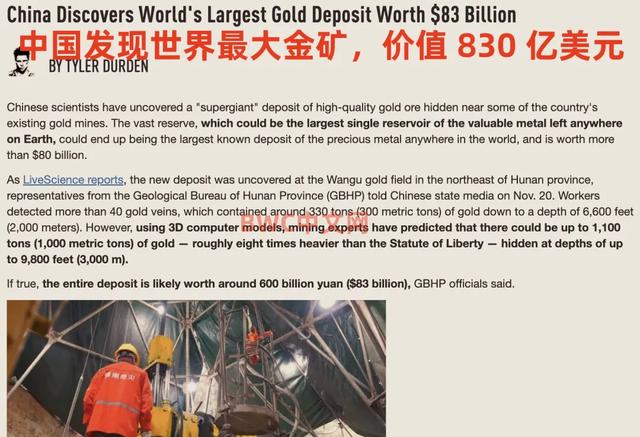 据全球贵金属行业机构LiveScience报道,湖南省地质局代表一周前向媒体透露,这一新矿床位于湖南省东北部的万古金矿区,发现了40多条金矿脉,其中含有约330吨黄金,深度达 2,000米,“许多钻探岩芯都显示出可见的黄金”,不仅于此,采矿专家利用3D计算机模型预测,地下3,000米深处可能隐藏着多达1,100吨的黄金储备,截至2022年,地球上已知最大的黄金储量位于南非的South Deep金矿,该矿山拥有约1,025 吨黄金。