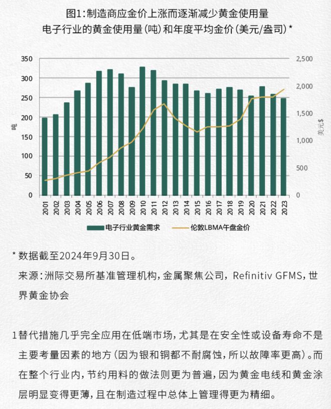 2001年至2011年间,金价从约250美元/盎司飙升至超过1,800美元/盎司,迫使电子行业制造商想方设法减少黄金用量。这些措施包括寻找替代品(用银和铜等代替黄金)和节约用量(使用更越来越少的黄金)等手段。