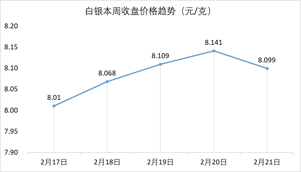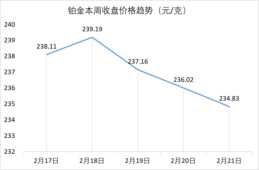 赤峰黄金通过港交所聆讯 2月17日,赤峰吉隆黄金矿业股份有限公司成功通过港交所聆讯,即将成为继紫金矿业、山东黄金后又一家实现“A+H”上市的黄金矿业企业。2024年,赤峰黄金预计实现归母净利润17.3亿—18亿元,同比增加115.19%—123.90%。 原材料价格一周走势 特别说明: 1.数据来源于上海黄金交易所; 2.黄金、白银、铂金价格分别对应Au99.99、Ag(T+D)、Pt99.95的每日收盘价; 3.2月21日数据为15:00最新价格。 【声明】文章图片部分来源于网络,如有侵权请告知删除。