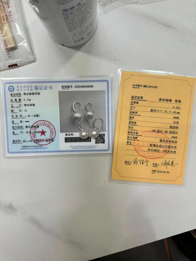 王女士说,在直播间商家说得非常正规,所有的产品都是有配套证书的。一开始她并没有想到去复检,后来有一个产品,觉得价格便宜得非常离谱,于是就拿去检验了。其中一对商家声称的海水珍珠耳饰被鉴定为淡水珠,而不规则海水珍珠keshi项链检测结果显示可能为海水、淡水珠混杂制成。