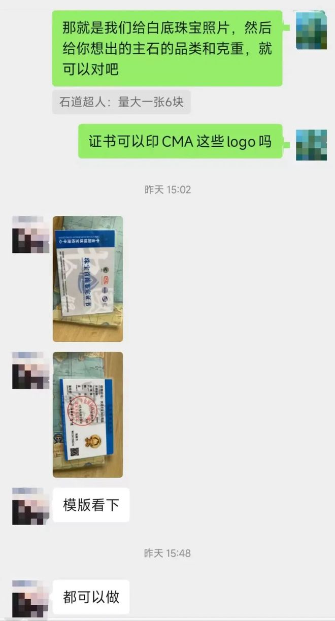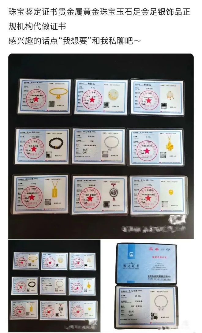 其中一个商家对记者表示,不需要快递实物,只需提供珠宝的白底照片就可以出证,想要出什么样的检测结论都可以。如果量少,一张证书收费10元,如果量大,每张只要5、6元。